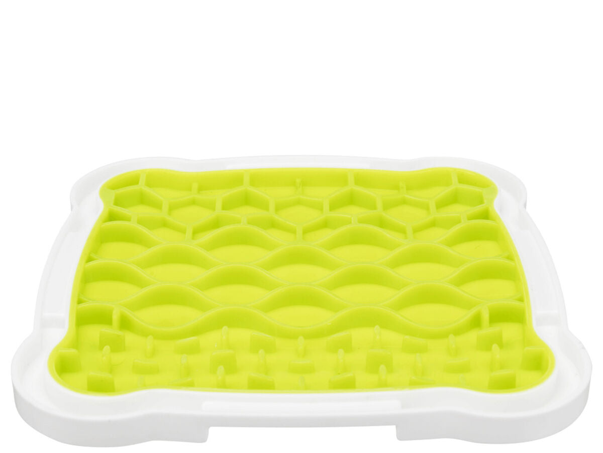 Trixie prekės gyvūnų maitinimo dubuo pasižymi funkcionaliu ir praktišku dizainu patrauklioje žalioje spalvoje, su maždaug 20 × 20 cm matmenimis, tinkantis mažų ir vidutinių šunų bei kačių veislių gyvūnams. Pagamintas iš patvarių ir saugių medžiagų – termoplastinės gumos (TPR) ir plastiko, suteikiančių tvirtą ir malonią liesti tekstūrą augintiniui. Šis dubuo sukurtas siekiant gyvūno gerovės, nes jo konstrukcija leidžia uždengti jį kremu, šlapiu maistu ar pieno produktais, palengvinant maitinimą ir pramogas. Ypatingai išskirtinė yra jo atgaivinimo funkcija – dubuo gali būti užpildytas skanėstais ir užšaldytas, taip suteikiant gaivų ir stimuliuojantį užsiėmimą ilgesnį laiką. Be to, jis turi skysčius sulaikantį kraštą, kuris apsaugo nuo išsiliejimo ir palaiko maitinimo vietą švarią. Svarbu ir tai, kad dubuo turi neslystančias kampines dalis, užtikrinančias stabilumą naudojimo metu, suteikdamos saugumą ir patogumą tiek augintiniui, tiek savininkui. Šis produktas skirtas sumažinti greitą skanėstų suėmimą ir skatinti ramybės akimirkas laižant, kas padeda augintiniui elgtis ramesniu ir kontroliuojamu būdu. Apibendrinant, Trixie dubuo derina kokybiškas medžiagas ir dizainą, skirtą sveikai gyvūno sąveikai, siūlydamas praktišką ir universalų sprendimą gyvūnų priežiūros reikmenims.
