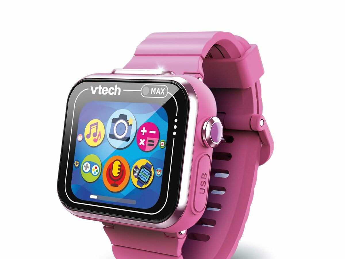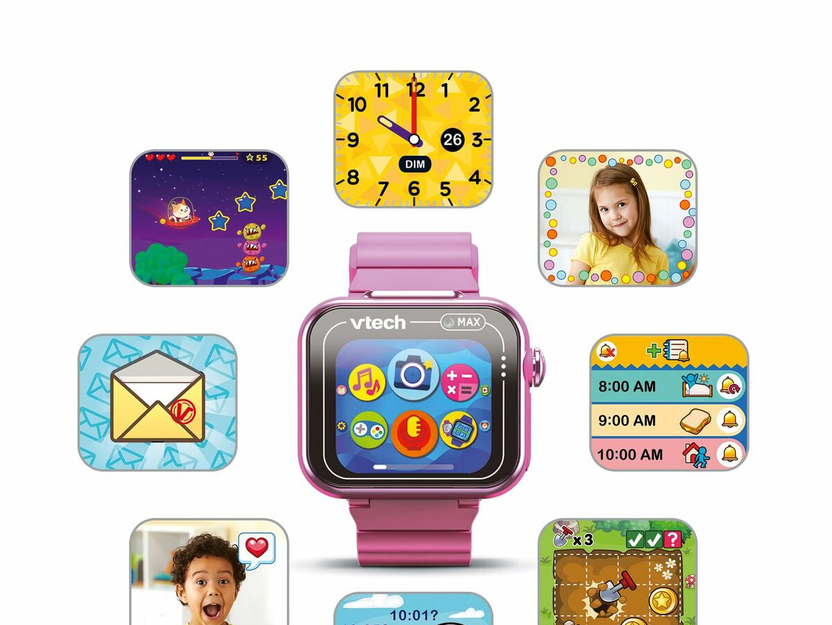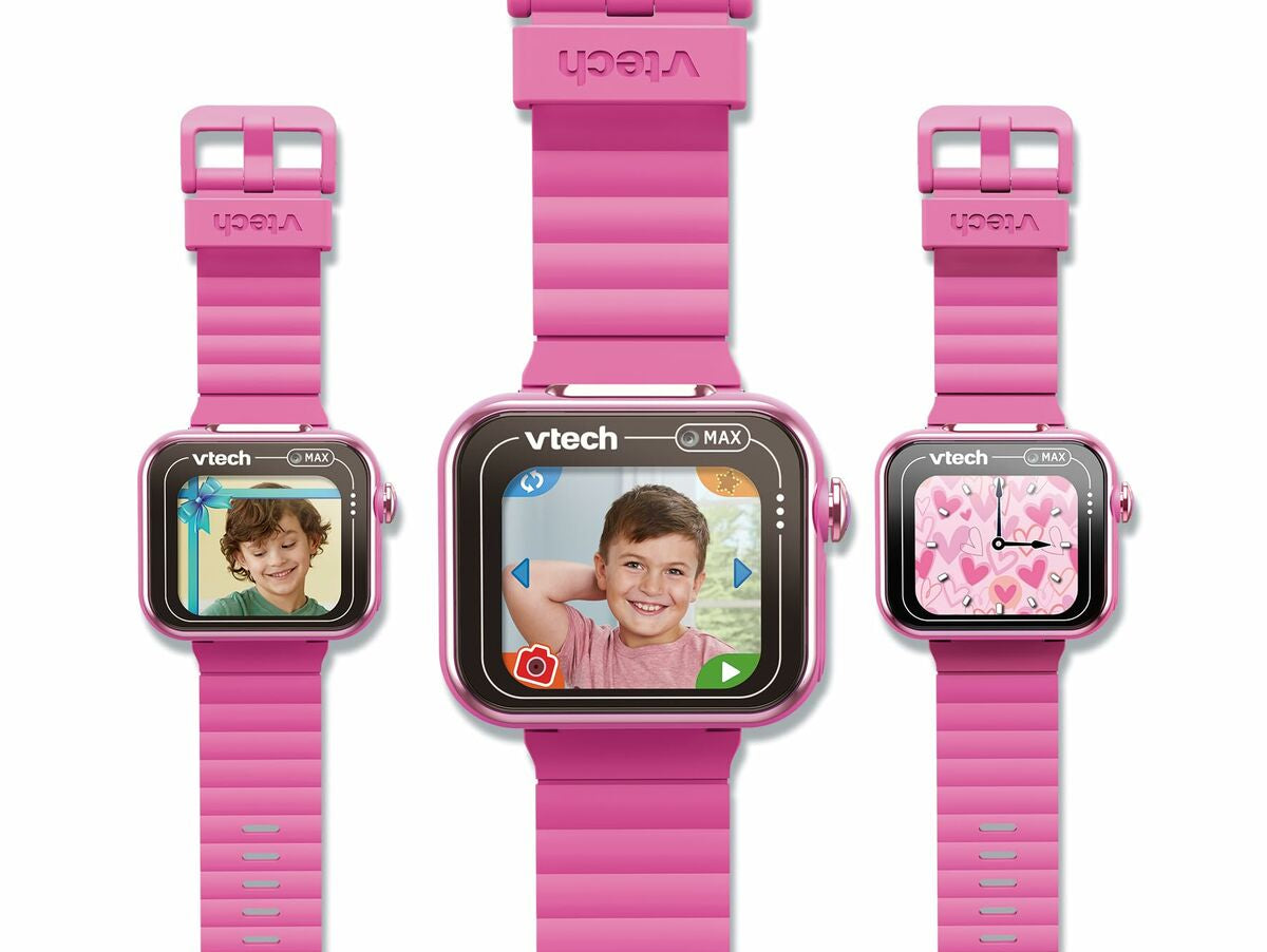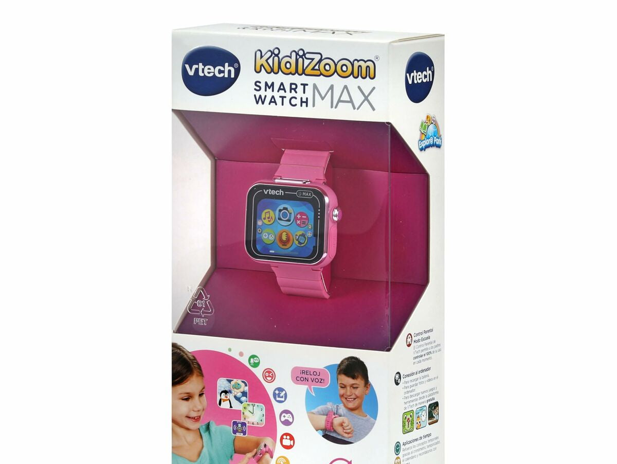 Kidizoom Smartwatch Max iš žinomos Vtech prekės ženklo – tai vaikiškas laikrodis, sukurtas vaikams nuo 4 metų, derinantis pramogas ir funkcionalumą patvariame ir patraukliame dizaine. Modelis pasižymi ryškiai rožine spalva ir vaikams pritaikytu dizainu, pagamintas iš , užtikrinančio atsparumą kasdienei vaikų naudojimo patirčiai. Įrengtas intuityvus jutiklinis ekranas, leidžiantis lengvai naršyti tarp įvairių funkcijų ir žaidimų, skatinant savarankiškumą ir pramogas. Kidizoom Smartwatch Max siūlo interaktyvią multimediją, įskaitant galimybę daryti nuotraukas, asmenukes ir vaizdo įrašus, taip pat balso įrašymo funkciją, skatinančią vaikų kūrybiškumą. Vidinė atmintis – 256 MB, suteikianti pakankamai vietos vaikų sukurtam turiniui, o kompaktiški matmenys, 5,4 x 22,4 x 1,7 cm, užtikrina patogumą ir pritaikymą vaikų riešui. Be to, laikrodis turi įvairių edukacinių žaidimų ir interaktyvių funkcijų, skatinančių mokymąsi saugioje ir amžiui pritaikytoje aplinkoje. Programinė įranga sukonfigūruota ispanų kalba (ES), palengvinant prieinamumą ir supratimą ispanų kalbos vartotojams. Šis vaikiškas laikrodis yra universalus įrankis ankstyvųjų technologinių įgūdžių ugdymui ir atsakingam pramogavimui, sukurtas lydėti vaikus kasdienybėje su prieinama ir įdomia technologija. Apibendrinant, Kidizoom Smartwatch Max – tai prietaisas, derinantis technologijas, kūrybiškumą ir patvarumą, pritaikytas vaikų poreikiams ir gebėjimams.