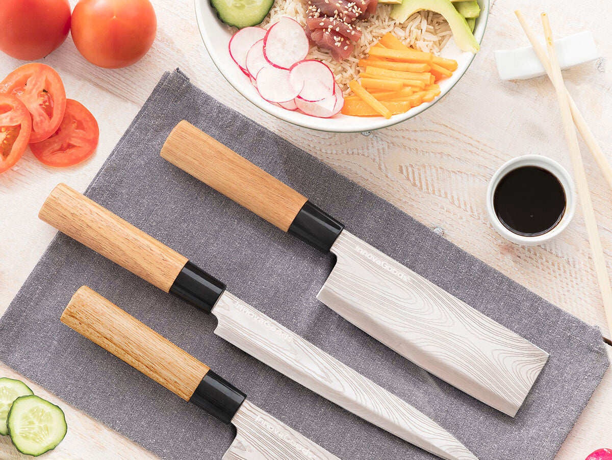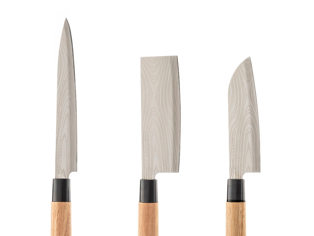- 3 profesionalūs peiliai: filiavimo, santoku ir skutimo peilis