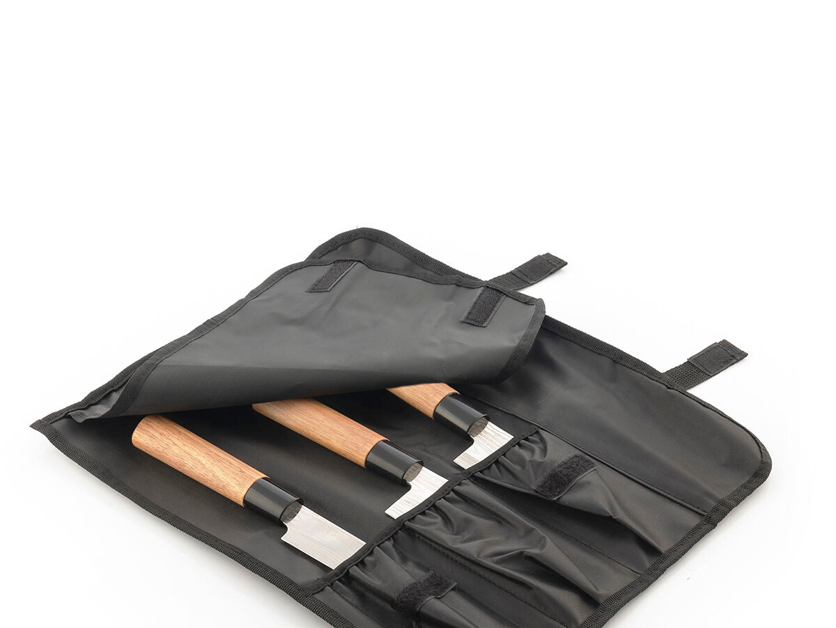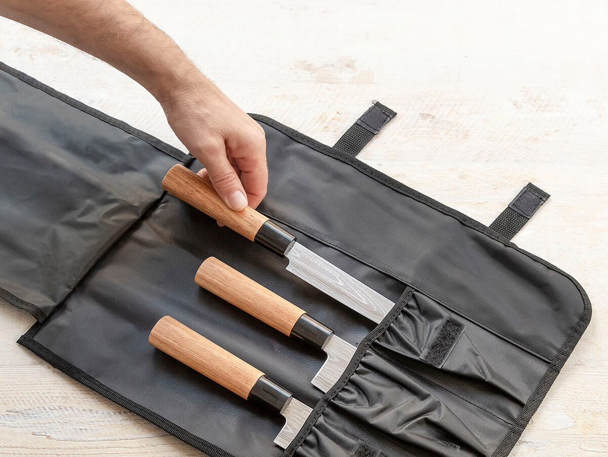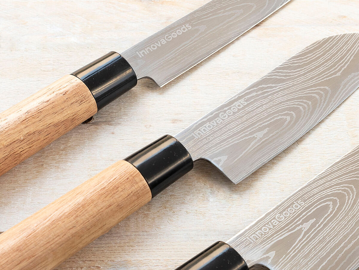 Visapusiškas aukštos kokybės profesionalių peilių rinkinys su profesionaliu nešiojimo dėklu ir Damasko stiliaus peiliukais su jūsų pasirinkta dizaino grafika (išgraviruotas lazeriu). Rinkinyje yra 3 rūšių peiliai: filė peilis (žuvims), kirvio peilis (daržovėms) ir santoku peilis (daržovėms, mėsai ar žuviai supjaustyti kubeliais). Tai puiki dovana, kurią įvertins net ir geriausi išskirtinių virtuvių virėjai.