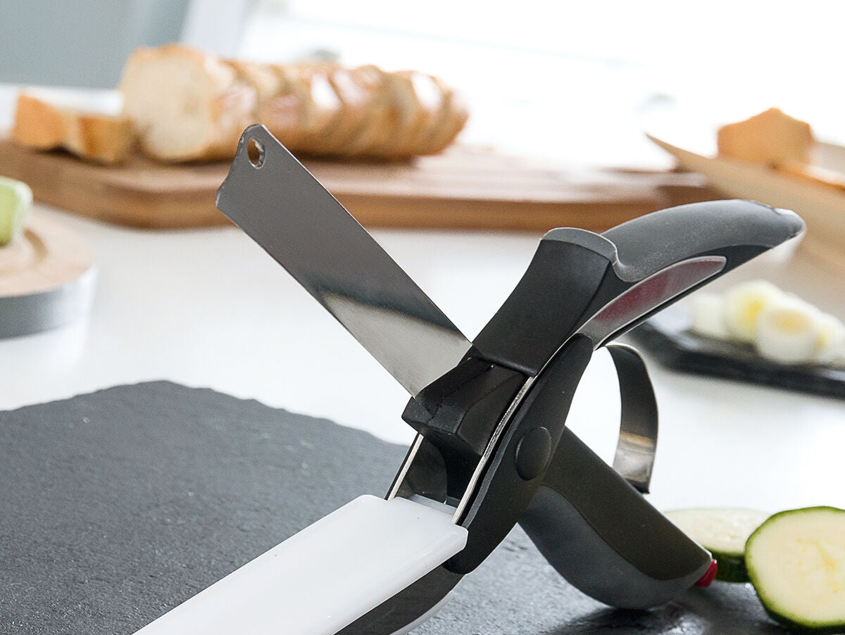 Ši originali virtuvės priemonė su inovatybiu dizainu integruoja peilį ir pjaustymo lentelę. Leidžia pjaustyti patogiai ir saugiai.