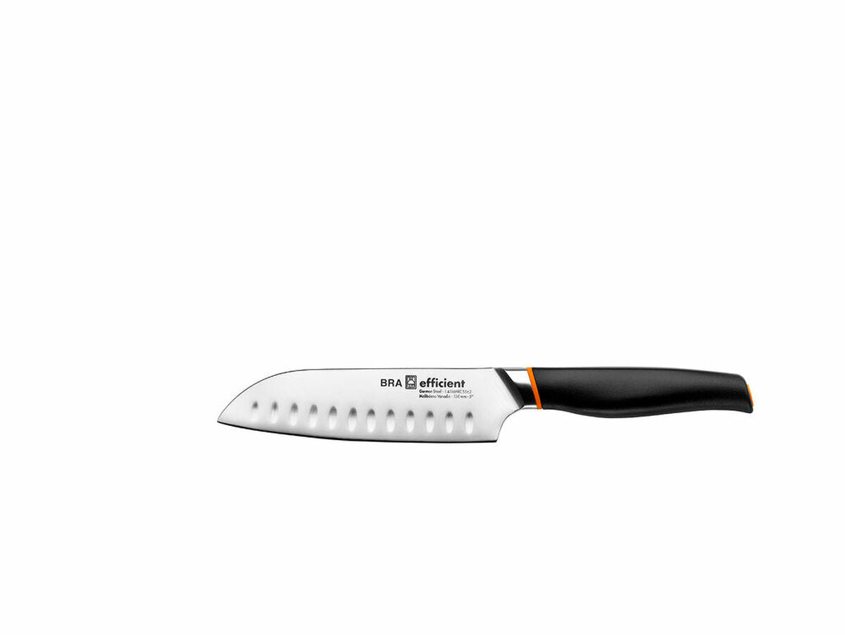 Santoku A198003 peilis iš BRA prekės ženklo yra nepakeičiama priemonė tiek profesionalioje, tiek namų virtuvėje, specialiai sukurtas tiksliai ir universaliai pjaustymo darbams, kurių reikalauja šiuolaikiniai šefai. Šis peilis išsiskiria savo nerūdijančio plieno geležte, kuri suteikia didelį atsparumą korozijai ir ilgaamžiškumą, užtikrindama nuolatinį aštrumą. 13 cm ilgio vidutinio dydžio geležtė suteikia puikų pusiausvyrą tarp valdymo ir pjovimo galios, ideali smulkinti, pjaustyti ir filė ruošti įvairius ingredientus, tokius kaip daržovės, mėsa ir žuvis. Santoku dizainas pasižymi platesniu ir tiesesniu profiliu nei tradiciniai virtuvės peiliai, kas leidžia atlikti švaresnius ir efektyvesnius pjūvius bei mažina nuovargį naudojant. Be to, rankena ir bendras peilio dizainas derina elegantišką juodos ir pilkos spalvų kombinaciją, kuri ne tik suteikia modernų ir santūrų vaizdą, bet ir užtikrina patogų bei saugų sukibimą, didinant tikslumą ir valdymą gaminimo metu. Ergonomika ir pusiausvyra tarp geležtės ir rankenos leidžia naudoti peilį ilgiau ir patogiau, todėl BRA Efficient Santoku peilis yra praktiškas ir patikimas pasirinkimas visiems, vertinantiems funkcionalumą ir kokybę virtuvės įrankiuose. Šis peilis jungia tradicijas ir naujoves, užtikrindamas vienodą našumą ir prisitaikydamas prie šiuolaikinės virtuvės reikalavimų su tvirtu ir efektyviu dizainu. Trumpai tariant, šis Santoku yra universalus ir ilgaamžis pjovimo sprendimas tiems, kurie ieško profesionalaus tikslumo ir kokybės kompaktiškame formate.