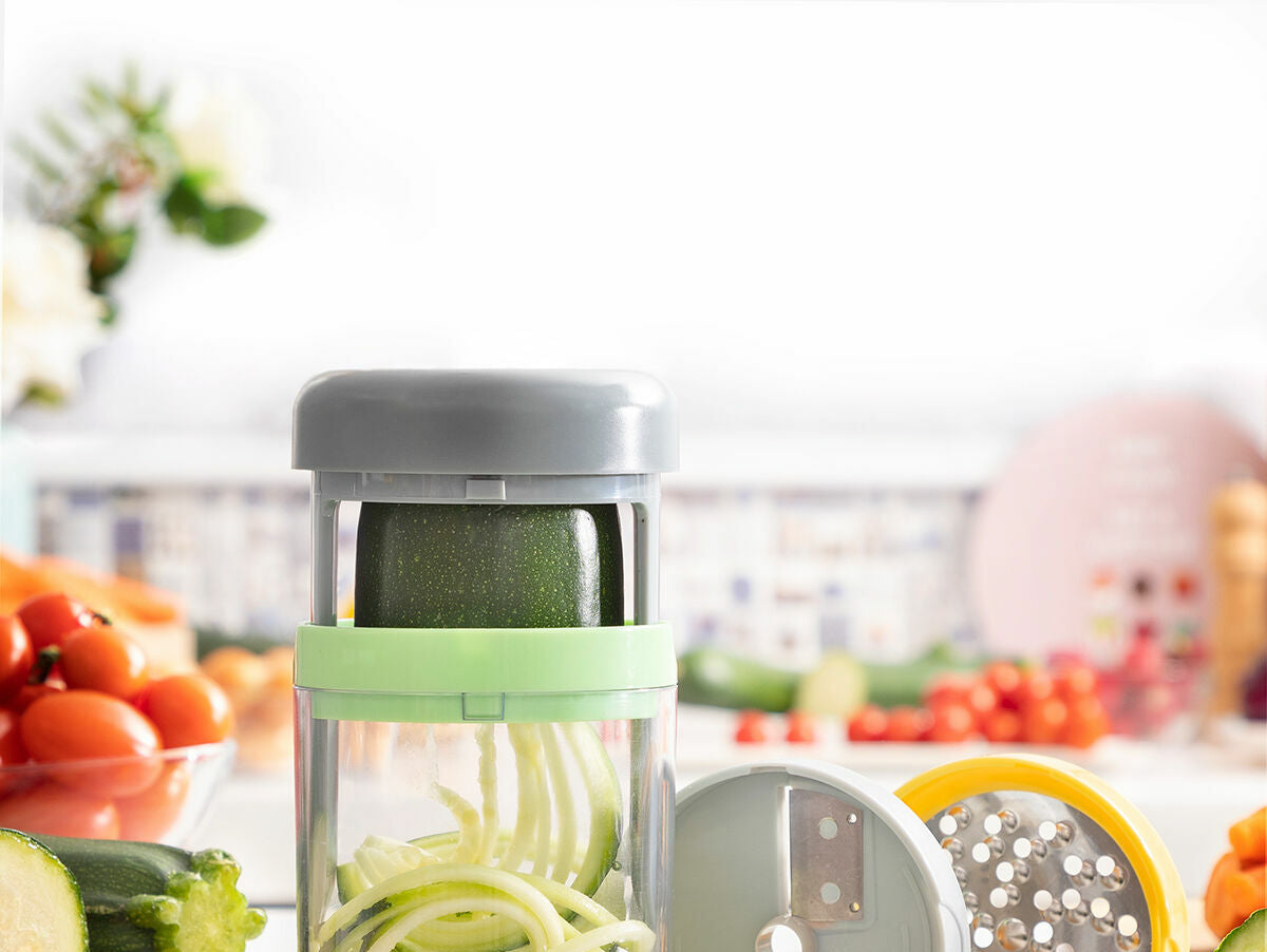 Ši rankinė daržovių pjaustyklė yra puikus pagalbininkas, padedantis lengvai paruošti sveikiausius ir išradingiausius patiekalus bei garnyrus. Jį sudaro įvairūs priedai ir instrukcija su apetitą žadinančiais receptais.