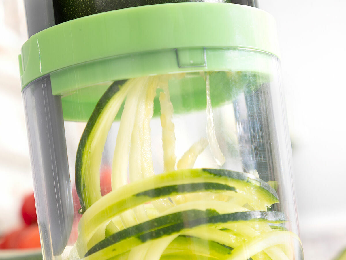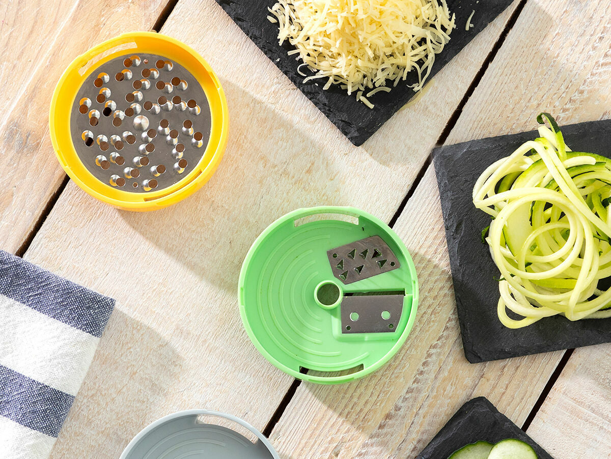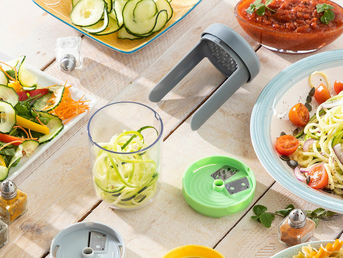 Ši daržovių pjaustyklė su priedais ir receptais turi dangtelį, kuris naudojamas kaip pirštų apsauga, todėl pjaustyti galima saugiau. Dangtis turi suėmimo taškus ir rankenėles, kad maistas tvirtai laikytųsi. Supjaustytas maistas sudedamas į indą. Trys pjaustymo priedai yra keičiami. Su pjaustymo priedu galima pjaustyti plačiomis juostomis. Spiralizavimo priedu spirale pjaustomi spagečių formos gabaliukai. Tarkavimo priedas puikiai tinka sūriui ir kietesniems maisto produktams tarkuoti.