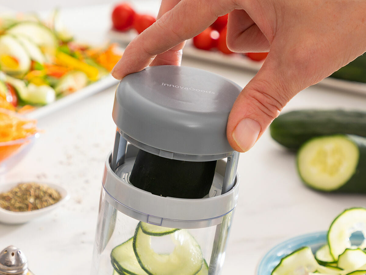 Vigizer InnovaGoods spiralinė daržovių pjaustyklė ir tarka su receptais idealiai tinka lengviau ir greičiau supjaustyti daržoves įvairių formų spiralėmis. Priklausomai nuo pasirinkto pjaustymo priedo, galite gaminti 3 rūšių pjaustinius: juostas, spagečius ir tarkius. Puikiai tinka tokioms daržovėms, kaip cukinija, agurkas, bulvė, morka ir t. t., nors jį taip pat galima naudoti vaisiams, sūriams ir kitiems maisto produktams.