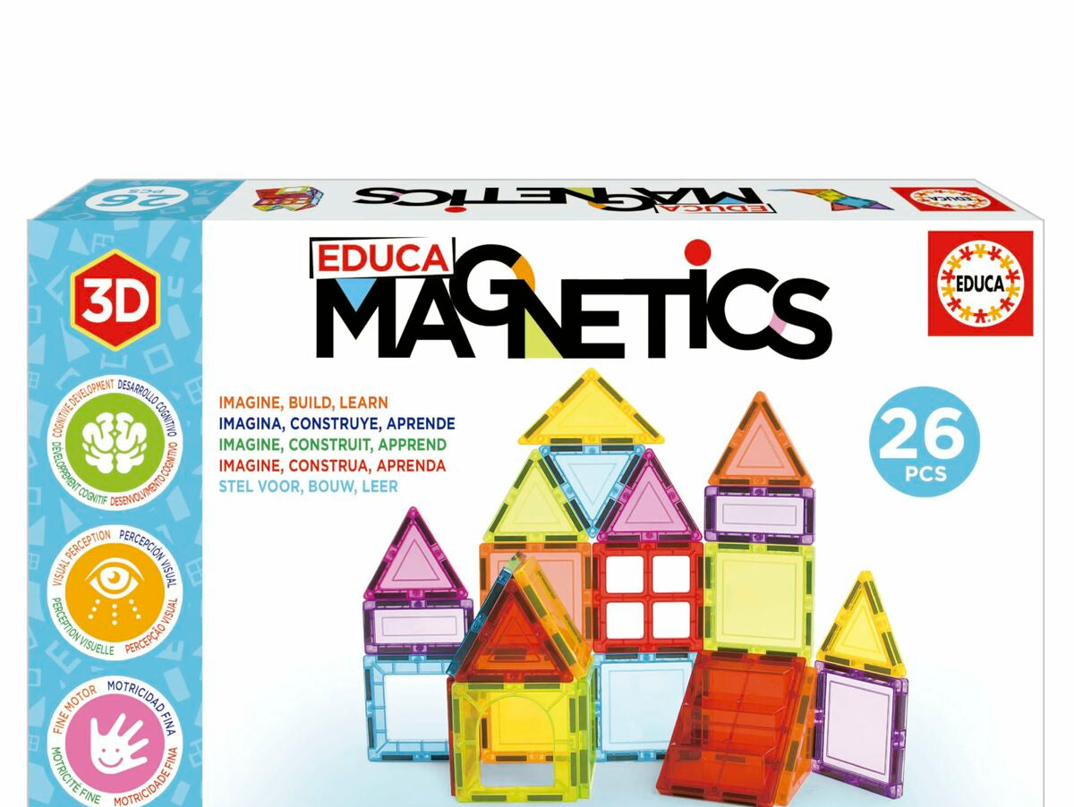 Educa Magnetics edukacinis žaidimas yra konstravimo rinkinys, sukurtas skatinti kūrybiškumą ir mokymąsi vaikams nuo 3 metų iki 6 metų ir vyresniems. Šiame žaidime yra 26 magnetinės detalės, pagamintos iš , užtikrinančio ilgaamžiškumą ir saugumą naudojimo metu. Dėl magnetinės sistemos vaikai gali jungti ir kurti įvairias konstrukcijas, skatinant smulkiąją motoriką, koordinaciją ir erdvinį suvokimą. Dizainas pritaikytas žaidimui ir mokymuisi dviem kalbomis – ispanų ir anglų, taip pat padeda susipažinti su pagrindiniais žodžiais abejose kalbose. Šis konstravimo žaislas ne tik mokymo priemonė, bet ir skatina kūrybinį žaidimą tiek individualiai, tiek grupėje, tinkamas naudoti namuose ar mokykloje. Educa prekės ženklas užtikrina kokybę ir funkcionalumą vaikų mokymosi produktams. Apibendrinant, Educa Magnetics yra veiksminga edukacinė priemonė, skatinanti kognityvinį ir rankų vystymąsi ankstyvame amžiuje.